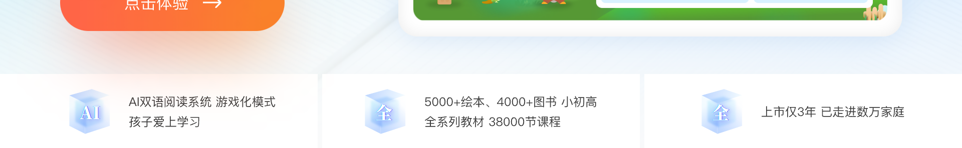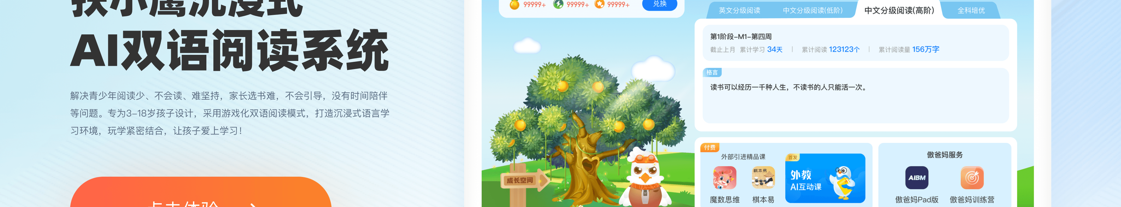 - 泛读:5000+AI英语读物,各种主题绘本,故事类与非故事类(如科普)结合,拓展阅读量,开拓孩子视野。